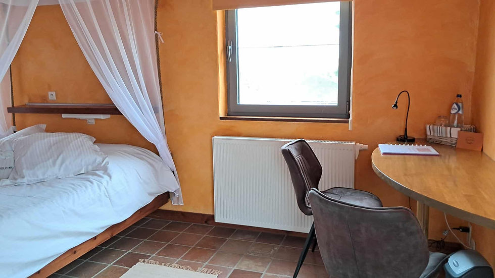 Der orangefarbene Raum umgibt Sie mit Wärme und Lebendigkeit, ohne dabei aufdringlich zu wirken.